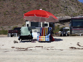We left Los Barriles after a 13 day stay. We just loved it there! It started to feel like home! Fresh Fruits and Vegetables right across the street from the resort! We were sad to leave! The day we left we stopped at the little town of El Triunfo and went to the mission, and walked through the town. It is such a neat little place. It was a mining town. We had lunch at the Triunfo Cafe and it was fabulous! We got to La Paz and stayed at Campestre Maranatha for a 2 day stay. We went grocery shopping for a few needs then back to the camp to change make lunch and head to the beach for the afternoon. We had the whole beach to ourselves, it was great!! From La Paz we drove to Ciudad Constitucion and stayed one night at Palapa 206 RV Park. This morning, March 11th we packed up and left for Loreto. We are staying at Loreto Shores RV Park for 3 nights. After we got set up we had a drink then changed into our bathing suits and went to the pool to cool off. We have had very hot weather 33C! I'm not complaining because back home in Alberta it is very cold and snowy!!